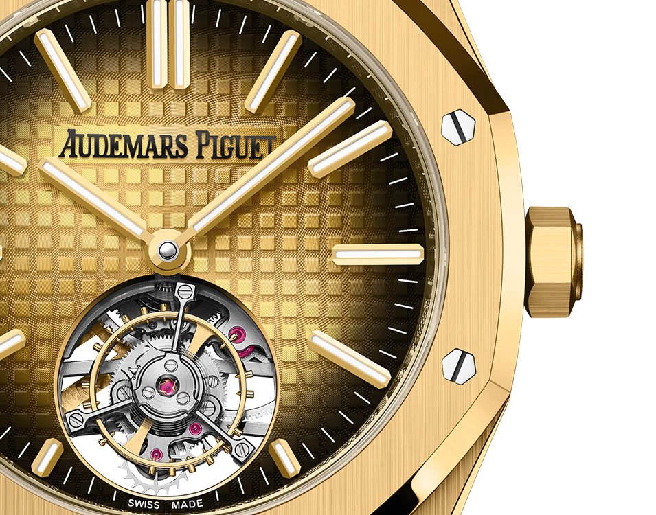 Dial: Smoked yellow gold-toned dial with âGrande Tapisserieâ pattern, yellow gold hour-markers and Royal Oak hands with luminescent coating.