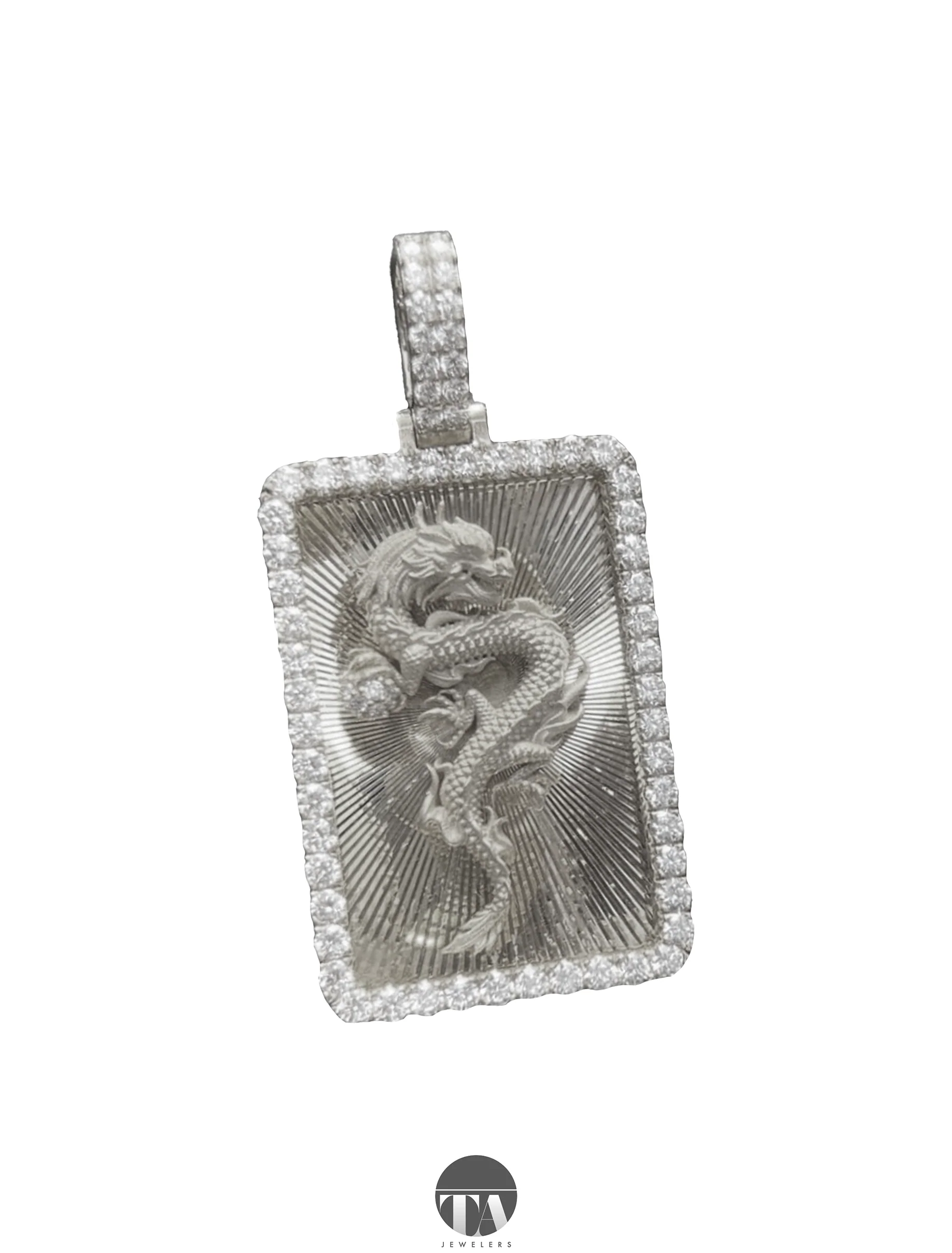 Solid 18K Yellow, White, and Rosegold Diamond Framed Dragon Pendant w/ Diamond Cut Background